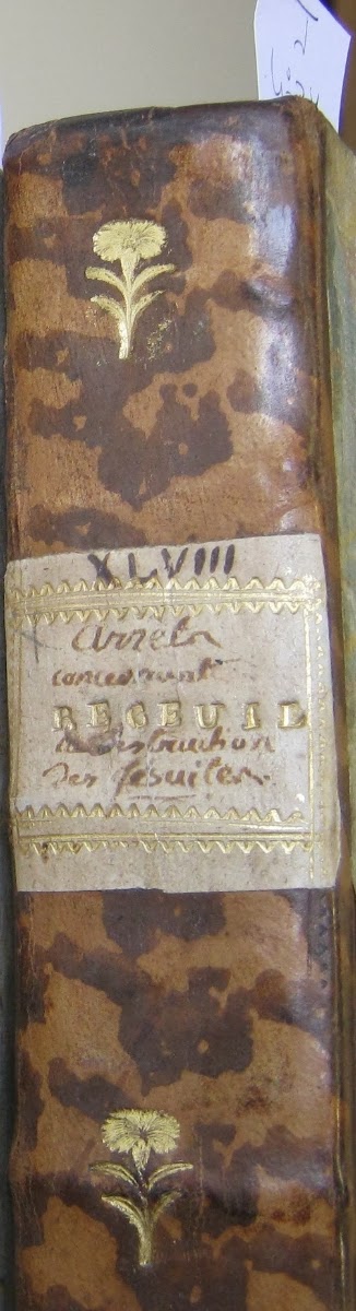 Vers 1773 il parait qu’on a décidé de mettre en ordre les entassements de papiers imprimés qui se trouvaient dispersés dans la Mission. Heureusement la tache n’est pas très bien accomplie. Ils n’ont pas bien trié les documents qui ont été reliés à peu près dans l’ordre qu’on les a trouvés. Ainsi on découvre plusieurs copies des mêmes documents reliés l’un après l’autre. Le relieur a quelquefois cousu un document au milieu d’un autre. [Reliures] Le relieur a estampillé le dos du volume avec un bref titre pas tellement explicatif de manière que, plus tard, un bibliothécaire l’a trouvé nécessaire de numéroter en encre beaucoup des volumes avec une indication plus évidente de leur contenu. Le numérotage s’étend au moins jusqu’à 59, ce qui montre qu’il reste des volumes à découvrir.