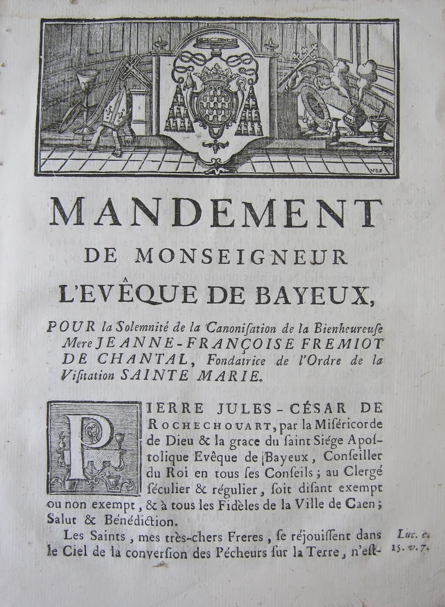 Une analyse de ces 1418 documents provoque des questions. Pourquoi les imprimés commencent-t-ils à devenir plus fréquents après 1724 ? Pourquoi y a-t-il plus d’imprimés originaires d’Evreux que de Bayeux ? Pourquoi tant d’imprimés du diocèse de Laon ? J’étais frappé par la similarité de style des Mandements d’Evreux et de Bayeux mais en préparant la liste des documents je n’avais pas les deux documents sous mes yeux en même temps. C’est seulement plus tard en regardant les images de plus près que j’ai constaté que le même nom et la même gravure en bois apparaissent sur les deux séries de documents et j’ai découvert que Pierre-Jules-César de Rochechouart était évêque d’Evreux avant de devenir évêque de Bayeux en 1753. Alors cette collection de documents n’avait rien à faire avec le séminaire de Bayeux mais n’est rien d’autre que la collection personnelle de l’évêque, arrivée avec lui à Bayeux, où il continua d’ajouter les documents jusqu’en 1773 quand, pensant peut-être déjà à sa démission en 1776, il les donna à la bibliothèque de la mission.