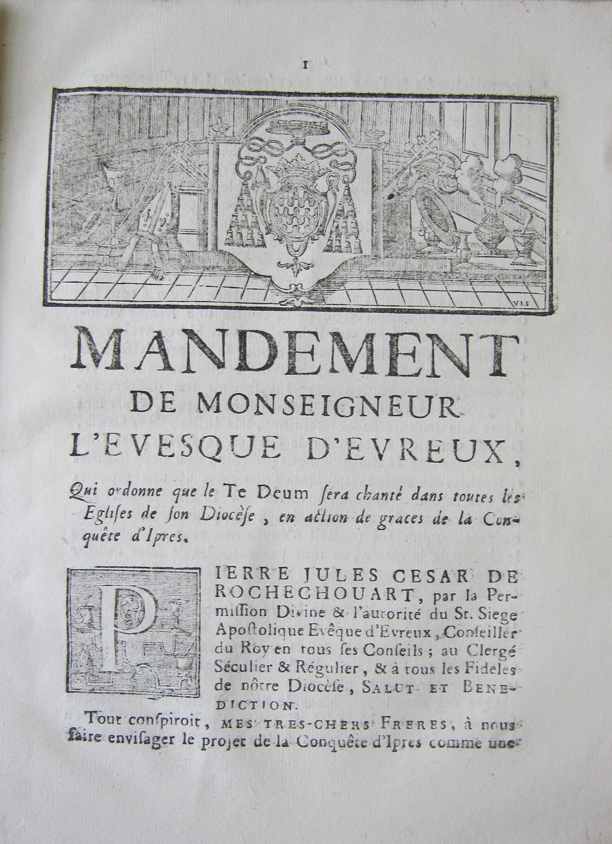 La Guerre de Succession d’Autriche produit une série de mandements, pour la prise d’Ath en 1743, les prises d’Ypres, de Furnes, de Menin, du comté de Nice en 1744,