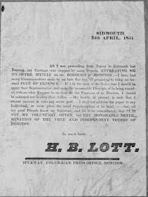 Lott, H. B. To the worthy and independent electors of the borough of Honiton. – Honiton : Spurway, general printing-office , [1831]. – 1 sheet. – Dated: Sidmouth, 24th April, 1831, 4 o'clock in the afternoon. - Held by: Devon Heritage Centre: sf324.61/HON/COL: item 008.