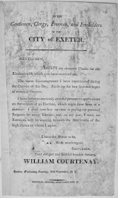 Exeter. 1812-09-30. Courtenay, William. To the gentlemen, clergy, freemen, and freeholders of the city of Exeter. Dated: Exeter, Wednesday evening, 30th September, 1812. - Exeter : Trewman , 1812. Held by: Devon Heritage Centre: Numbered: 4. - Sources: Cullum (1812), p.16.
